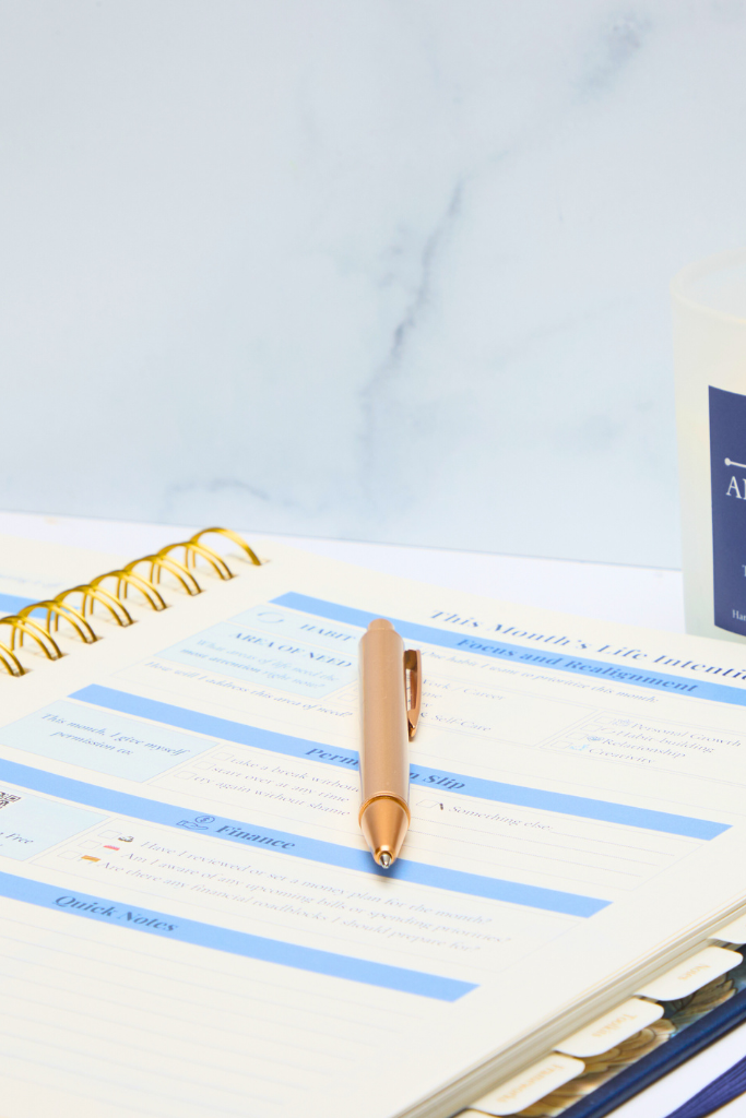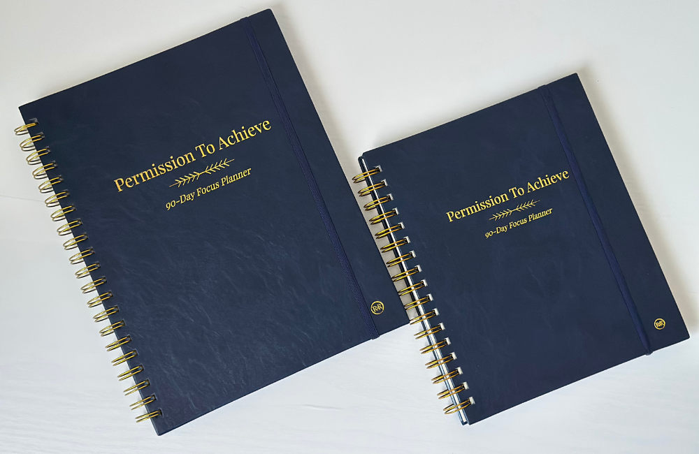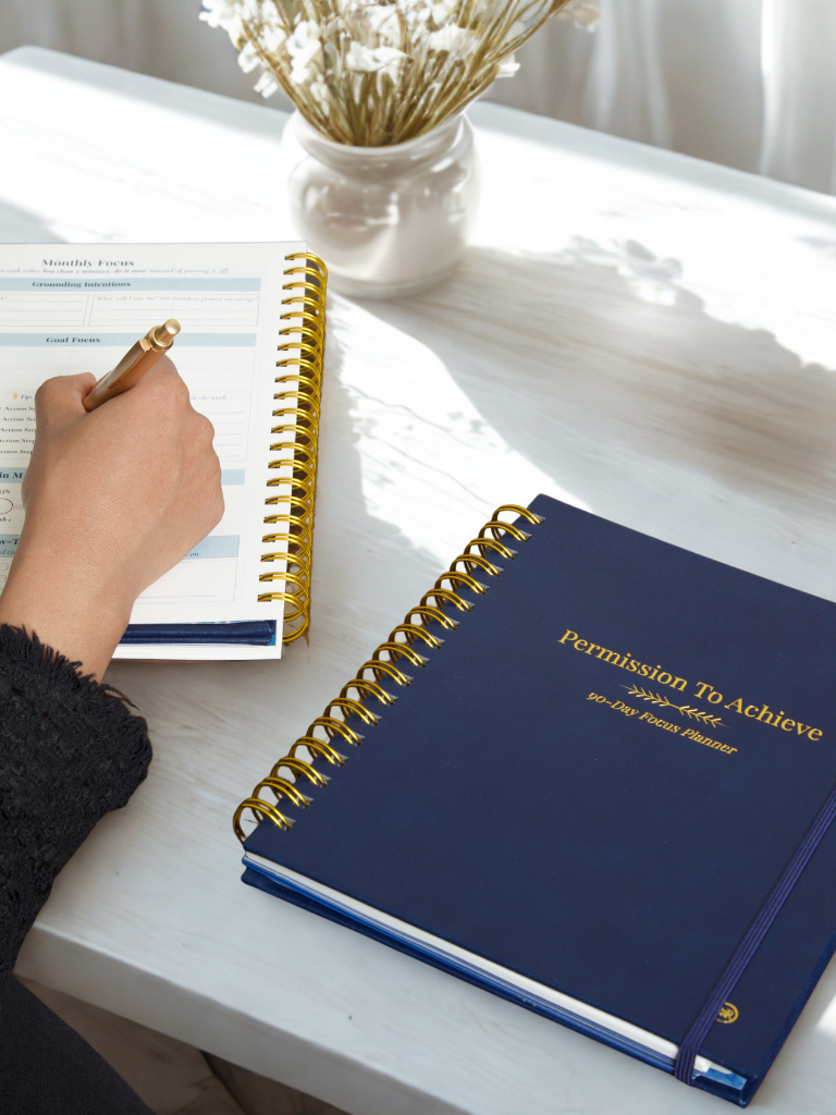 The Permission to Achieve™ Planner is a guided productivity system in planner form. It helps you set meaningful goals, and stay grounded in what matters across your work, relationships, health, and finances.